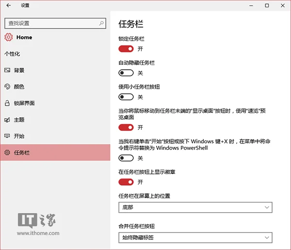 另外,从14328开始,任务栏属性被彻底移动到设置中,原有Win32版界面被取消。设置中的选项比Win32版更加一目了然,方便操作,如下图: