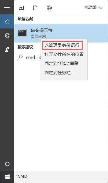 1、在Cortana搜索栏输入CMD,然后在第一个结果点击右键,选择“以管理员身份运行”