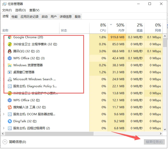 3、常用的解决方法就是选择不需要的进程,点击【结束任务】。