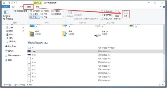 1、打开“此电脑”或“资源管理器”,点击顶部的“查看”,然后点击右侧的“选项”;