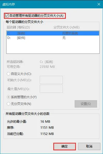5、勾选“自动管理所有驱动器的分页文件大小” 点击应用并确定即可。