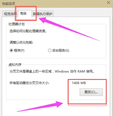 弹出一个“性能选项”卡,点选上方的“高级”,选择“更改”。