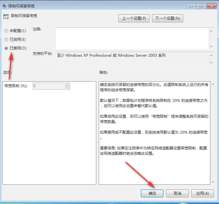 6、最后将“限制可保留宽带”禁用,点击确定即可。