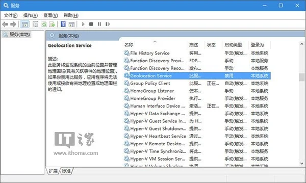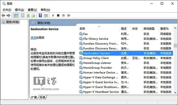 2、在服务中找到名为Geolocation Service的服务,双击打开其属性。
