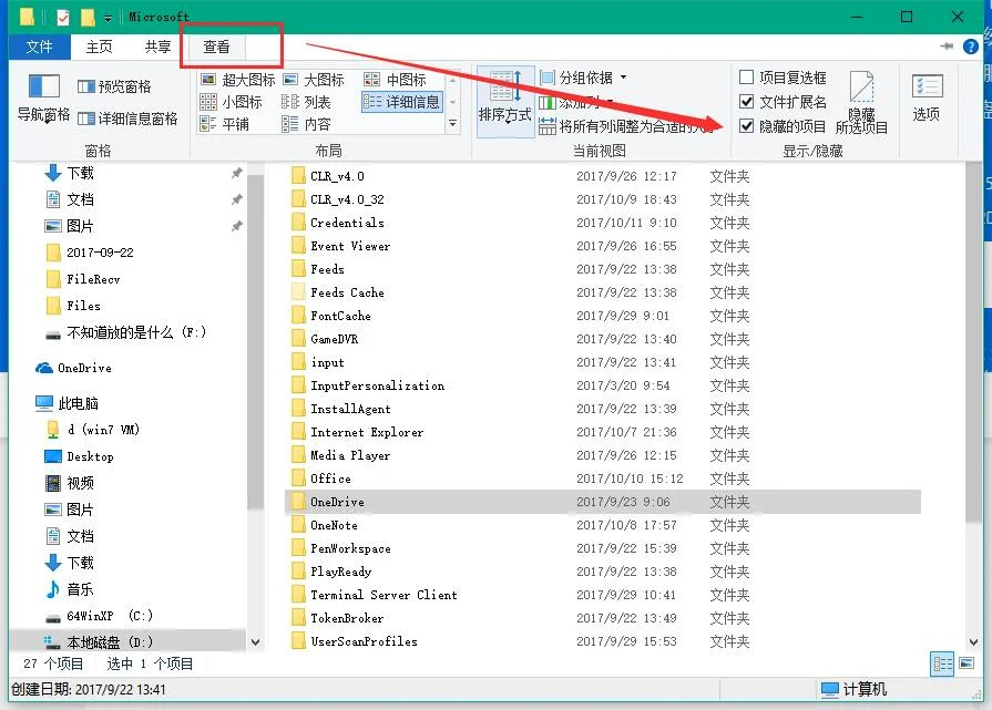 4、在硬盘里删除OneDrive文件夹,随便打开一个文件夹,在上面点击查看之后勾选隐藏的项目复选框。