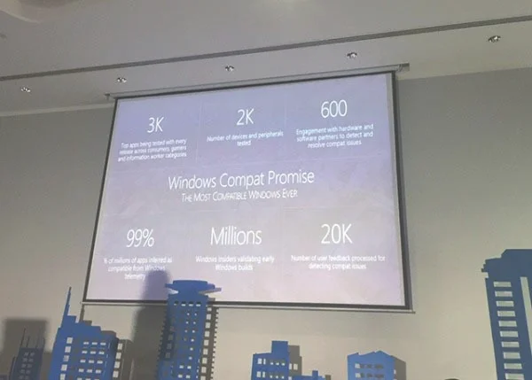 NexTech上,微软展示了一个有意的数据,那就是Windwos 10的兼容性。从数字上看,微软与600家硬件和软件合作伙伴一起测试了3000款热门应用、2000款硬件设备和外围设备,而Windows 10兼容性达到了99%。