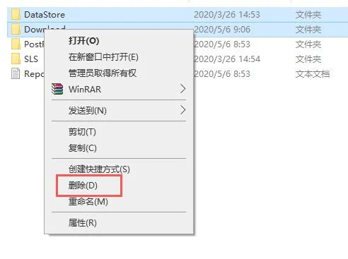 6、接下来选中该文件夹中的“Datastore”与“Download”文件夹,然后右键点击这两个文件夹,在弹出菜单中选择“删除”菜单项,把这两个文件夹删除。