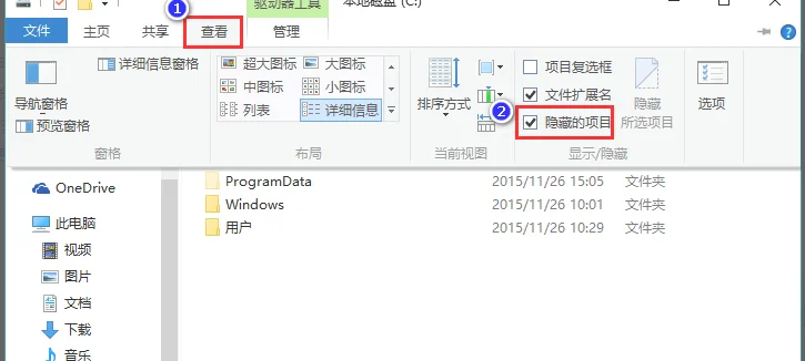 2、点击“查看”菜单,然后勾选“隐藏的项目”。