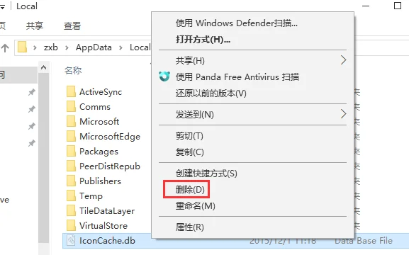 4、在打开的文件夹中,找到 Iconcache.db,将其删除。