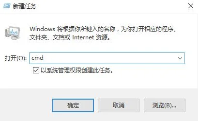 3、在打开的新建任务 框中 勾选 以系统管理权限创建此任务 ,然后在框中输入 cmd 点击【确定】即可。