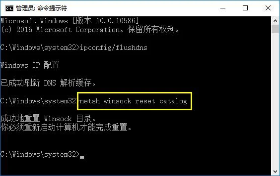 3、接着输入“netsh winsock reset catalog”命令按回车,如下图所示: