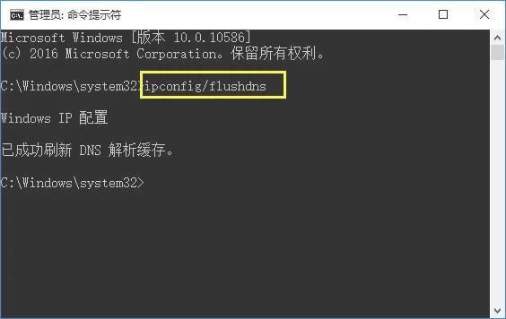 2、进入到命令提示符界面后,输入“ipconfig/flushdns”命令按回车,如下图所示: