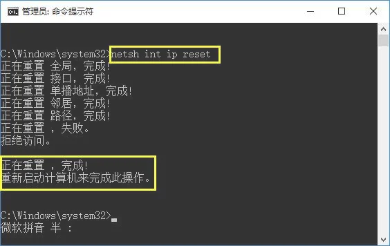 4、最后输入“netsh int ip reset ”命令按回车,重启电脑就可以上网了,如下图所示: