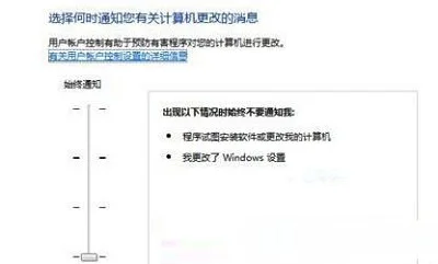 4、点击更改用户账户控制设置,将移动标下拉至不通知。
