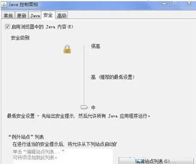 2、打开java,切换到“安全”选卡,将安全等级拉到最低;