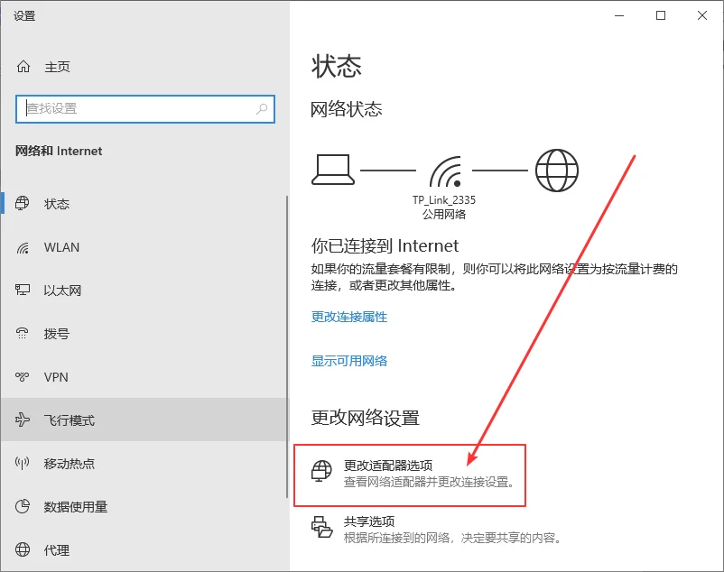 2、打开网络和共享中心后,点击打开左侧的「更改适配器设置」,如下图所示。