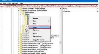 2、打开注册表,按序点击展开:ComputerHKEY_CURRENT_USERSoftwareClassesLocal SettingsSoftwareMicrosoftWindowsCurrentVersionAppContainerStoragemicrosoft.microsoftedge_8wekyb3d8bbweChildren,并右击选择每一个子选项001、002等,点击删除。