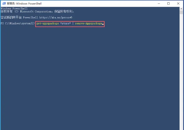 之后,以管理员身份打开“Windows Powershell ”,输入并执行命令【get-appxpackage *store* | remove-Appxpackage 】;