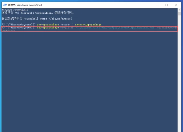接着,执行命令【add-appxpackage -register “C:Program FilesWindowsApps*Store*AppxManifest.xml” -disabledevelopmentmode 】;