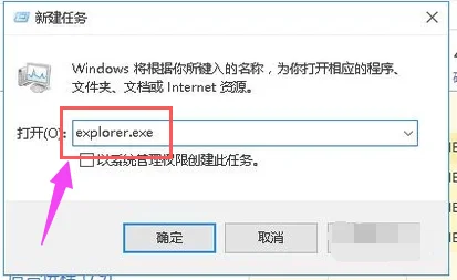 3、在打开一栏中输入explorer.exe,并按下回车。之后屏幕就可以正常显示了。