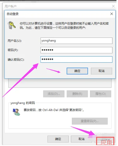 4、弹出一个自动登录对话框,输入管理员账户密码,确定之后,重启电脑即可无需密码登录。