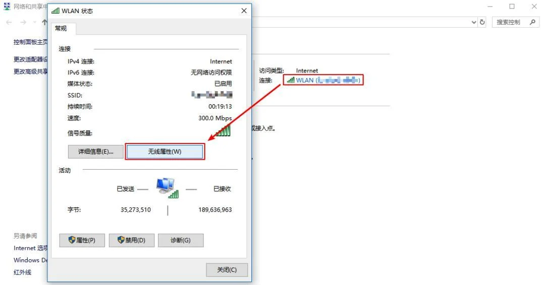 ④ 打开后会调出“WLAN状态”窗口,选择“无线属性”按钮
