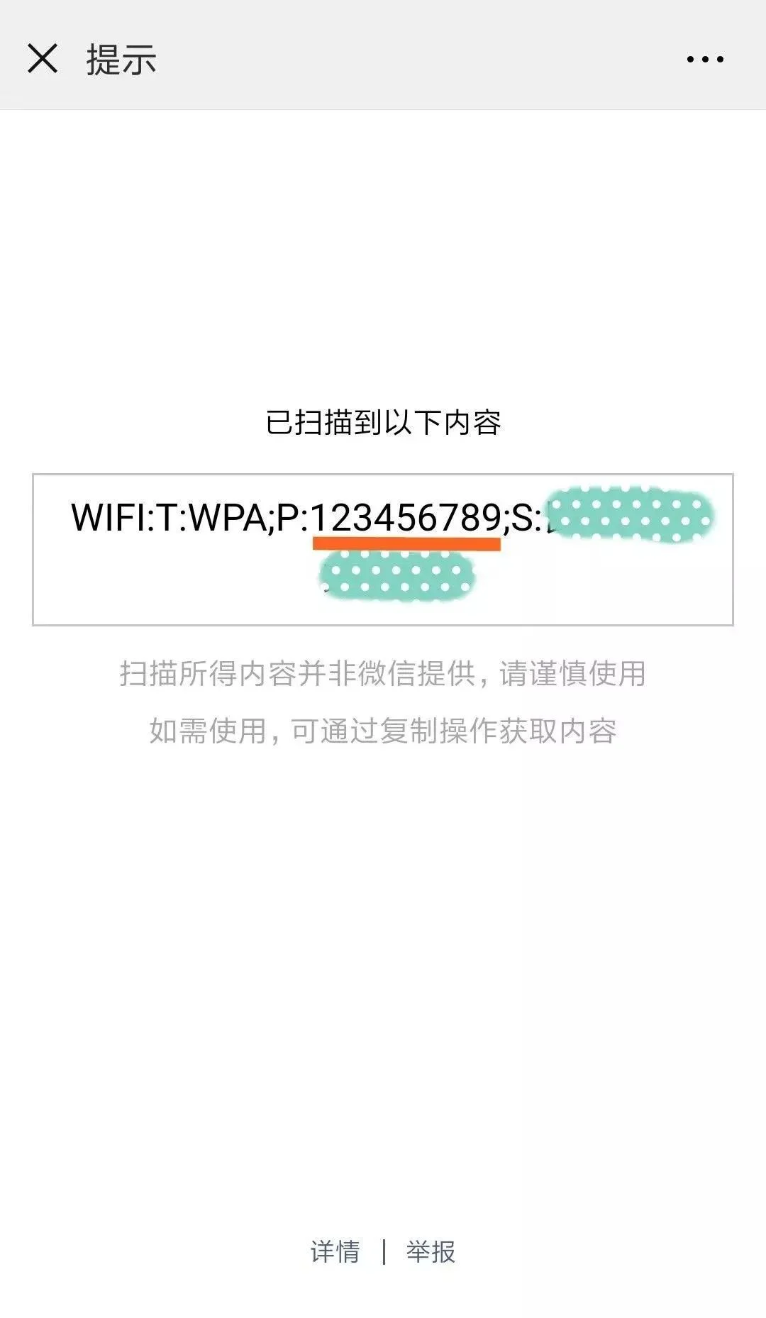 温馨提醒:顺便给大家介绍下如何查看手机连接的WiFi密码,相信大部分手机系统已经可以通过二维码分享WiFi密码了。以MIUI系统为例,打开WLAN设置,点击连接的WiFi,会弹出连接的WiFi的二维码,截图二维码后,大家可以通过系统或者微信的“扫一扫”功能即可查看WiFi信息。