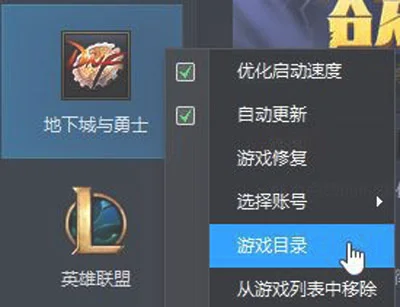 1、打开地下城与勇士的客户端所在路径,如果使用TGP的用户可以通过在左侧游戏列表中将鼠标移动到地下城与勇士的图标上,此时会出现一个 ↓ 的箭头点击该箭头,点击【游戏目录】即可;