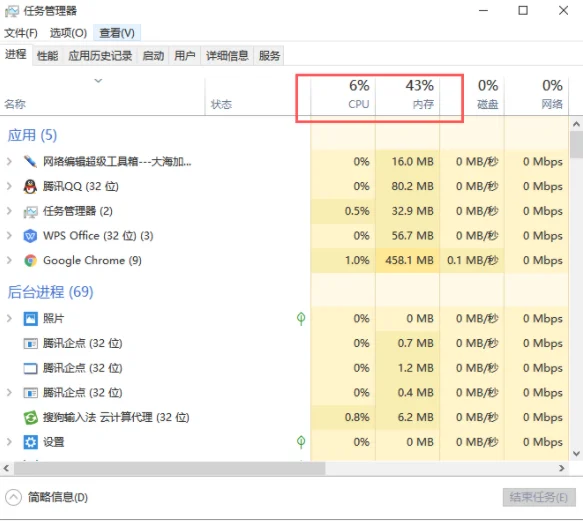 方法一:首先查看自己的CPU、内存占用是不是达到100%。