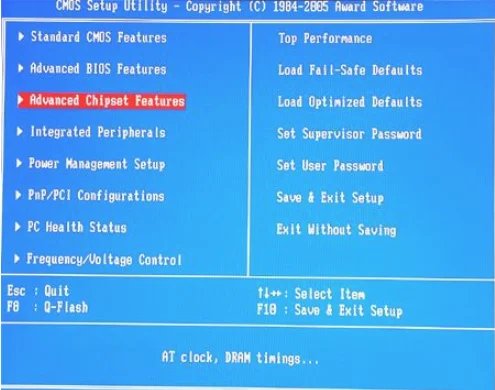 1、开机按快捷键(一般为del、F12、F2 键,不同电脑品牌启动bios快捷键不同,可以自行网上查询)进入bios,选择下图中的“Advanced Chipset Features”,回车进入。
