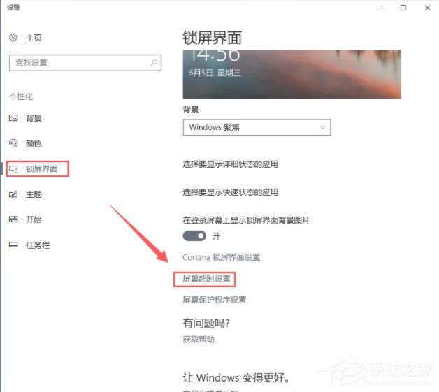 4、出现的界面左侧选择【锁屏界面】,右侧选择屏幕超时设置。