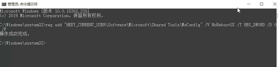 reg add “HKEY_CURRENT_USERSoftwareMicrosoftShared ToolsMsConfig” /V NoRebootUI /T REG_DWORD /D 0 /F