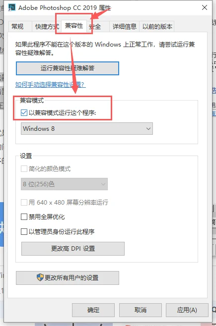右键应用程序,点击菜单中的”属性”,选择”兼容性”页签,勾选“兼容模式”选项框。