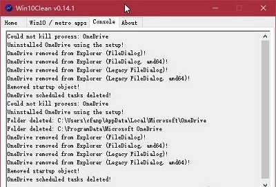 在执行所有上述自动化优化的过程中,Win10Clean的Console选项卡窗口中会自动产生相应的过程记录,详细记录某项优化过程中所执行过的命令或产生的影响(图4)。