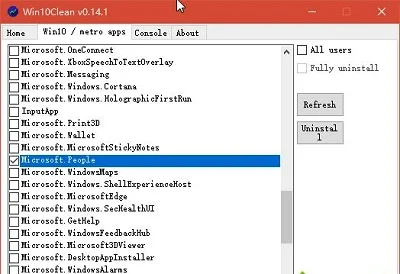 Windows 10系统中还默认内置了许多系统组件和应用,对于其中一些自己几乎用不到的,可一次性将其处理掉。进入Win10Clean的“Win10/metro apps”选项卡,从列表中选择不再需要的组件或应用,然后点击Uninstall按钮即可一次性卸载(图2)。