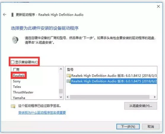 9.取消【显示兼容硬件】的勾选,在左侧选择【Realtek】声卡设备,再在右侧选择日期最新的版本,点击下一步安装驱动,安装完成后重启电脑即可。