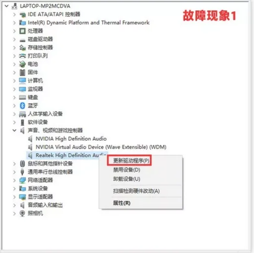 5.在设备管理器中选择【声音、视频和游戏控制器】,右键点击【Realtek High Definition Audio】或【Intel High Definition Audio 】—更新驱动程序