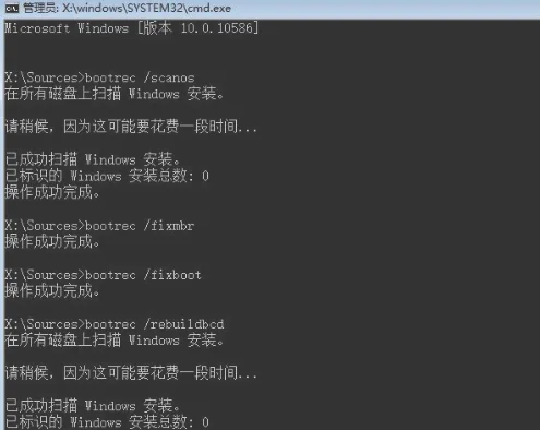 5、最后依次执行如下命令修复 Win10 的主引导记录并重建 BCD 配置文件: