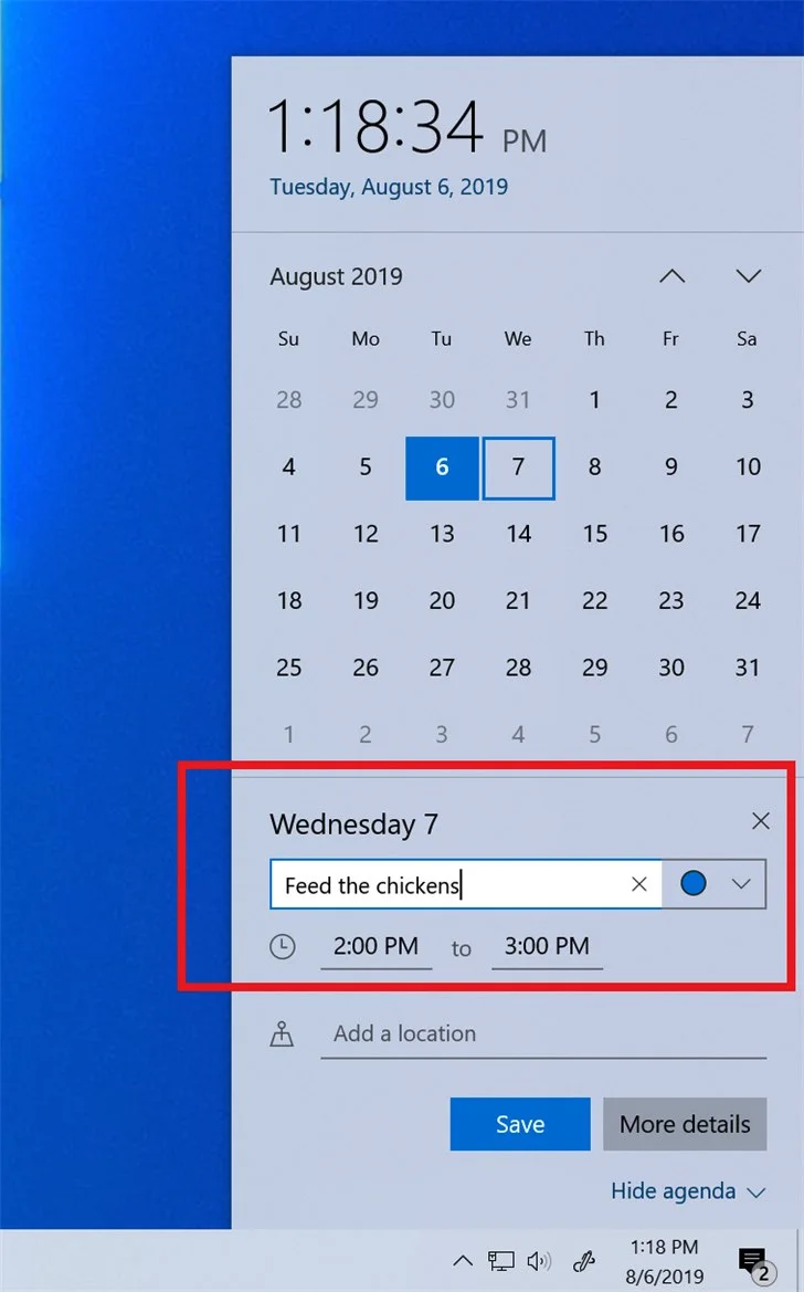 5.你现在可以直接利用任务栏上的日历弹出按钮快速创建事件。只需单击任务栏右下角的日期和时间即可打开日历弹出按钮,并选择所需日期开始在文本框中输入 – 你现在将看到内联选项以设置时间和位置。