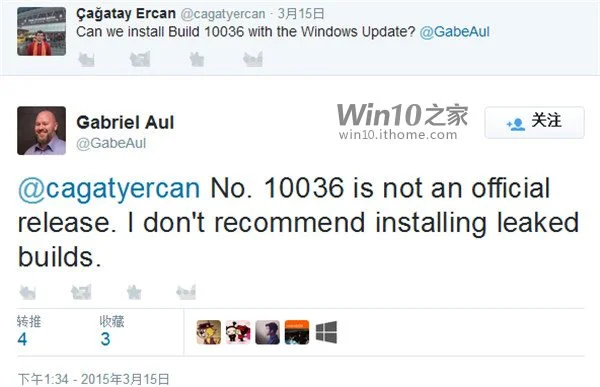 此外Gabriel Aul还发推建议大家不要安装泄露版Build 10036,那些没有下载安装泄露版Build 10036的用户还须继续耐心等待。