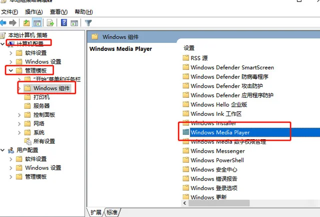 2、在“本地组策略编辑器”窗口中,依次展开“计算机配置–》管理模版–》Windows组件”命令选项,在右侧窗格中找到“Windows Media Player”选项,选中并双击打开;
