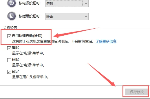第五步:勾选启用快速启动(推荐),点击保存修改,重启即可。
