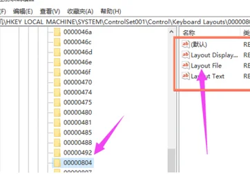 第二步:打开注册表编辑器,点击路径【HKEY_LOCAL_MACHINE SYSTEMControlSet001ControlKeyboard Layouts】,仔细检查,会发现以0804结尾的都是简体中文输入法。