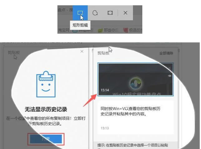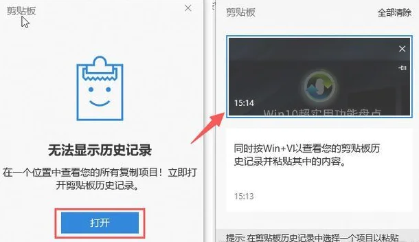 开启姿势:同时按Win+V出现剪切板界面,然后点击【打开】按钮