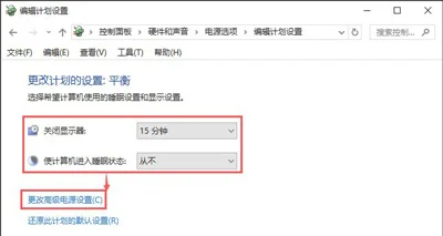 如果一定要平衡模式来运行操作系统,则可以打开“更改计划设置”,将“关闭显示器”设置为自己要设置的时间,将“使计算机进入睡眠”时间设置为“从不”,再点击“更改高级电源选项”之后将无线适配器的模式设置为“最高性能”。