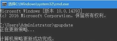 4、在命令提示符框中输入:gpupdate 按下回车键,等待提示更新完成,然后重启计算机即可