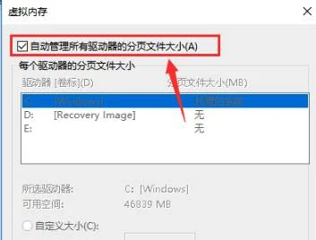 6、将“自动管理所有驱动器的分页文件大小”前面的√去除。
