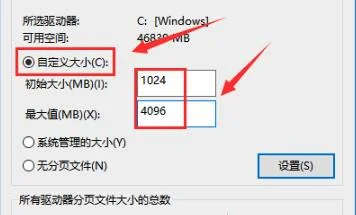 7、随后点击中间的“自定义大小”将内存数值设置在1024~4096MB之间即可。