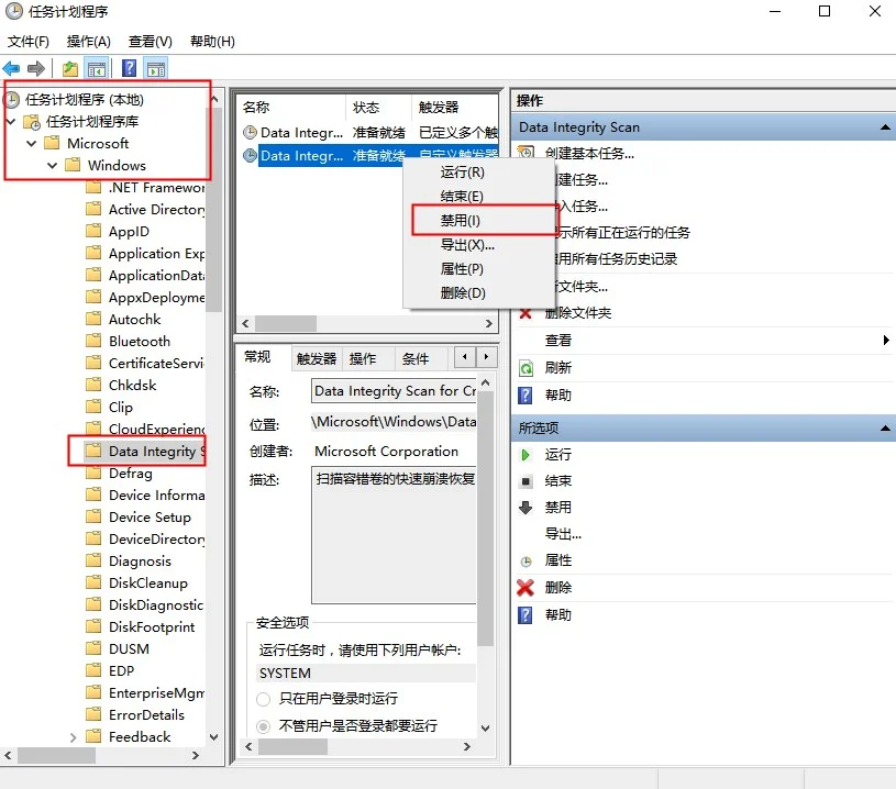 4、然后在左侧依次点击并展开:任务计划程序库MicrosfotWindowsData Integrity Scan。然后找到该程序,点击【禁用】。便能够解决了,但是输入法可能会出现问题哦。