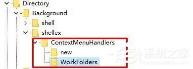 3、展开“contextmenuhandlers”项后我们除了将“NEW”、“WorkFolders”选项保留住,其他的子项都删除即可。